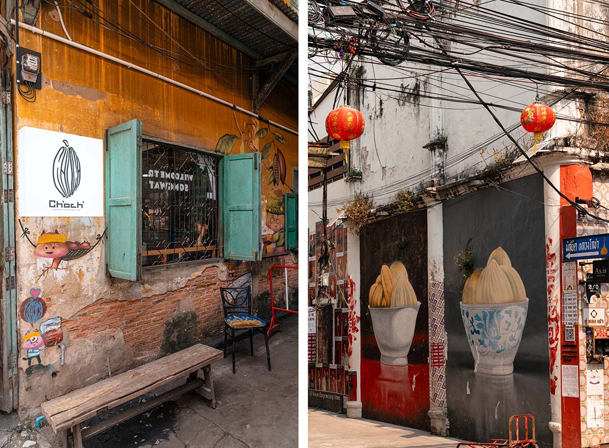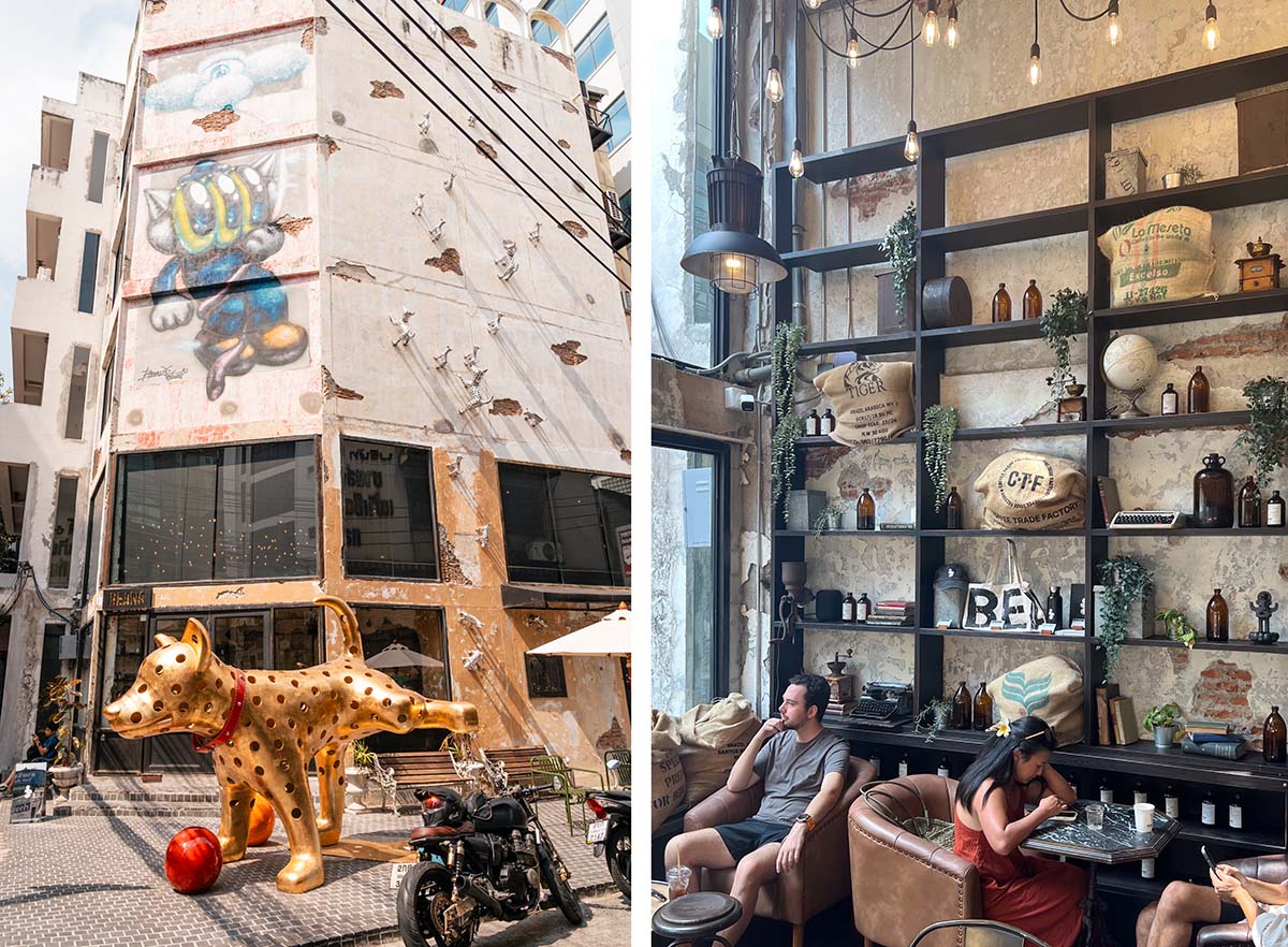 In het hart van Talat Noi zit Timo & Tintin, een café waar ze heerlijke koffie serveren. Het café beneden is klein, maar het gebouw heeft verschillende verdiepingen waar kunstenaars hun werk tentoonstellen. Ik dronk hier een americano van bonen uit Chiang Rai en dat was de beste koffie van Thaise bonen die ik in heel Thailand heb geproefd.