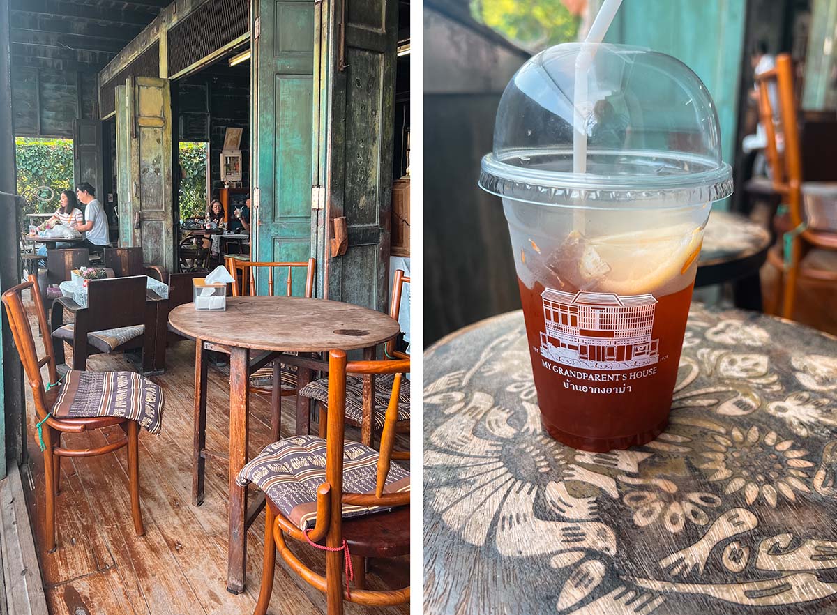 My Grandparent’s House ligt nergens dichtbij, maar ik wilde het koffiehuis toch graag zien. Ik stak daarom de rivier over, bezocht de naastgelegen Gong Wu Shrine en koelde daarna af bij My Grandparent’s House. Dit is een prachtig oud houten huis direct aan de rivier, ingericht met oude Thaise meubelen. Het is, zoals de naam al zegt, het huis van de grootouders van de eigenaren en is een fijne plek voor een koffie- of lunchstop.