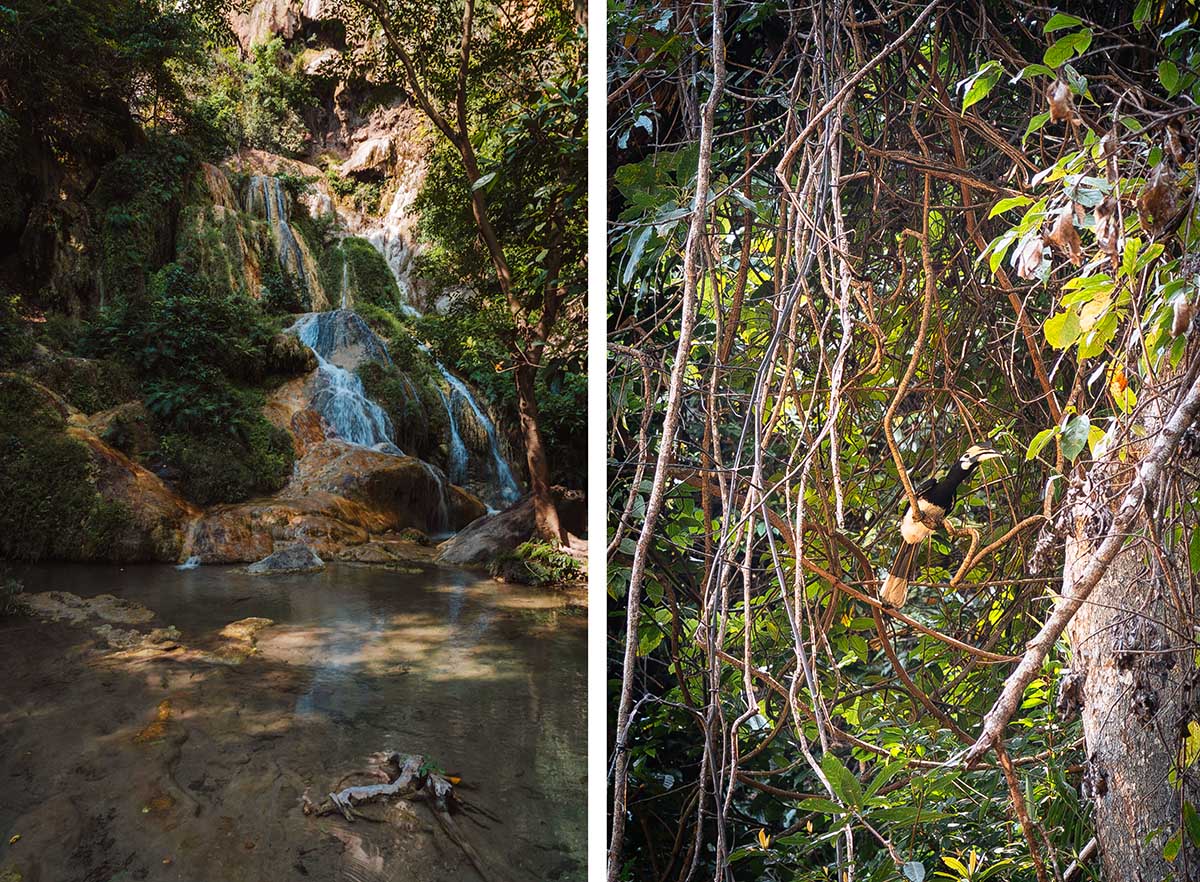 Op ruim een uur rijden van Kanchanaburi ligt Erawan National Park en de rit er naartoe is prachtig. Je rijdt over bergwegen met mooie uitzichten en komt uiteindelijk uit bij de Erawan-watervallen. Ik was hier om 09.00 uur, nog voordat de tourgroepen arriveerden, en ik had de watervallen vrijwel voor mezelf. De watervallen liggen midden in de jungle en hebben zeven niveaus. Je loopt omhoog door de jungle, in totaal ongeveer anderhalve kilometer wandelen. Omdat het nog vroeg was, vond ik het niet te warm en het klimmetje goed te doen. Ik genoot enorm van de helderblauwe poelen, de vele watervallen en de rust. In de jungle spotte ik zelfs nog een hornbill-vogel, geweldig om te zien!