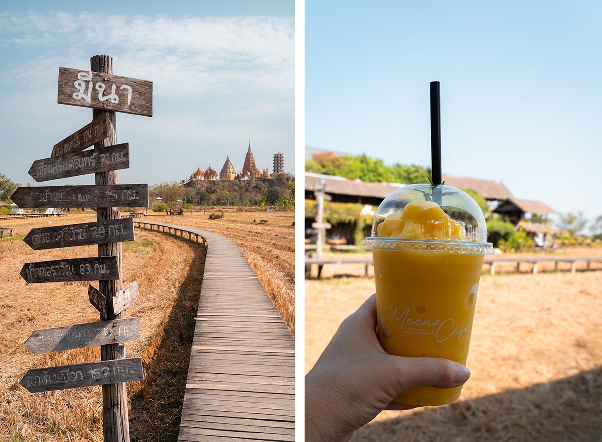 Na al die tempelbezoeken had ik wel zin in een smoothie, dus maakte ik een tussenstop bij Meena Cafe. Dit hippe café heeft een perfect uitzicht op de Tiger Cave Tempel en ligt midden in de rijstvelden. Toen ik er was, waren de velden helaas net geoogst, maar het was nog steeds mooi. Meena Cafe heeft talloze leuke plekken om te zitten en van het uitzicht te genieten. En van je smoothie of koffie met iets lekkers natuurlijk.