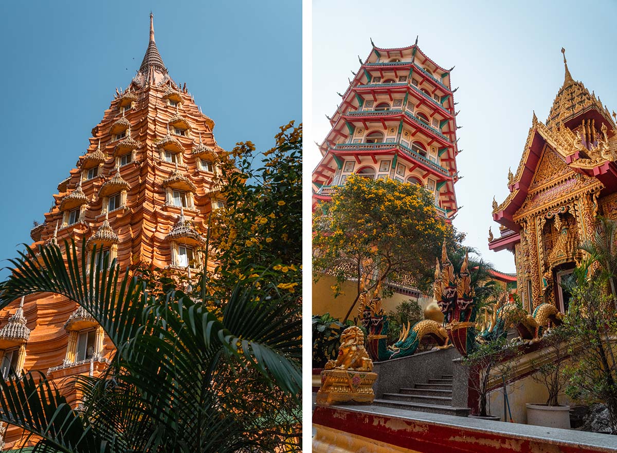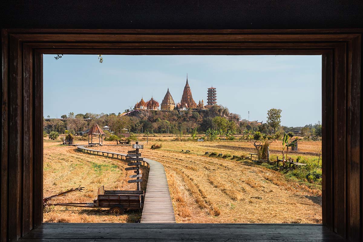 Een paar kilometer verderop ligt de volgende tempel: Wat Tham Suea. Dit is de Tiger Cave Tempel en het is één van de mooiste bezienswaardigheden in Kanchanaburi. Het tempelcomplex is gebouwd op een heuvel en bestaat uit een groot aantal kleurrijke tempels in verschillende stijlen. De tempels zelf zijn prachtig, er is een enorme zittende Boeddha te bewonderen en ook het uitzicht over de rijstvelden is de moeite waard.