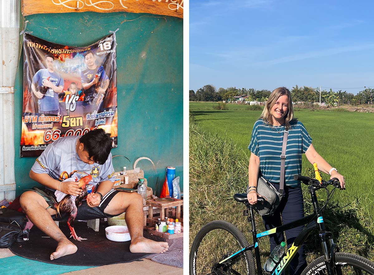 Ik houd van tourtjes waarbij je een inkijkje krijgt in het dagelijkse leven van de locals. Niet spectaculair, gewoon leuk en interessant. In Sukhothai boekte ik daarom dit leuke fietstourtje over het platteland van Sukhothai. Mijn gids pikte me rond 15.00 uur op en in no time fietsten we tussen de rijstvelden. Onderweg maakten we verschillende leuke stops, zoals bij een huis waar hanen en buffels werden voorbereid op wedstrijden. We bezochten een lokale markt rond een oude tempel, waar we lekkere snacks inkochten voor een picknick. Ook bekeken we een nieuwe tempel en een meubelmakerij voor teakhouten producten. De zonsondergang zagen we op een prachtige plek bij de rijstvelden, met uitzicht over de heuvels. Een superleuke tour, echt een aanrader!