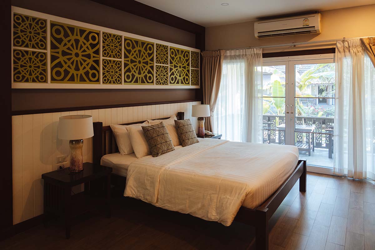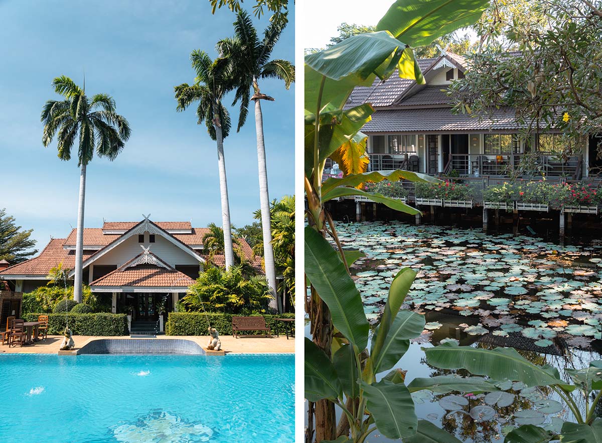 Mijn hotel in Sukhothai was Le Charme Sukhothai Historical Park, een heel fijn hotel aan de rand van Old Sukothai. Het dorp ligt op loopafstand, maar fietsen is handiger. Voor een paar euro huur je bij Le Charme een fiets. Dat is dus geen goede fiets, maar je redt het er wel mee. Le Charme ligt rond een mooie tuin met een vijver, heeft een groot zwembad en fijne, grote kamers. Het ontbijt is ook prima. Goede keuze!
