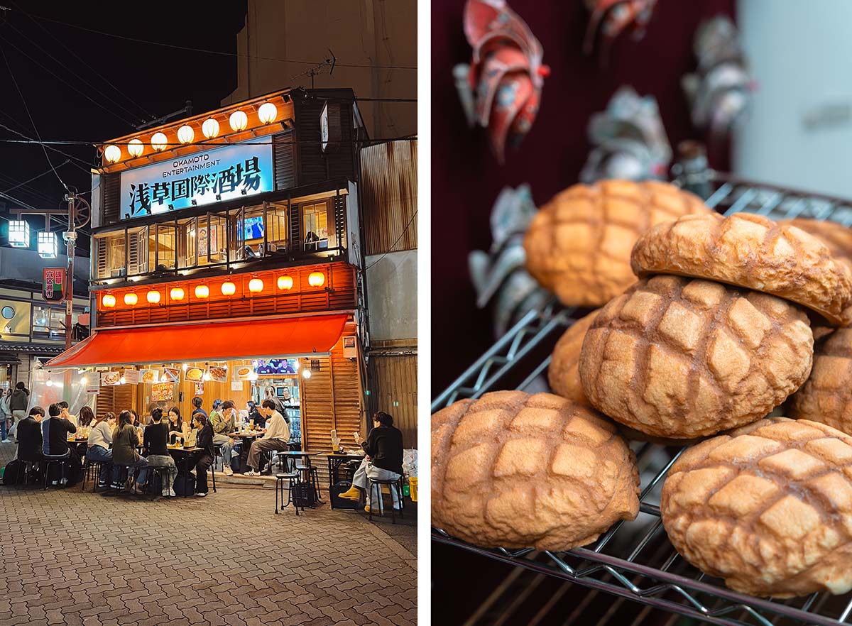 Eén van de leukste dingen om te doen in Tokyo is natuurlijk eten. De omgeving van Sensō-ji is perfect om allerlei bijzondere snacks uit te proberen. Bij Asakua Kagetsudō Melon Breadbakken ze bijvoorbeeld verse melon pan: luchtige zoete broodjes, bedekt met een knapperige koeklaag in ruitpatroon. Het brood smaakt niet naar meloen, de naam is ontstaan vanwege de gelijkenis met een meloen (die ik ook niet zo zie, maar goed). Je kunt het broodje laten vullen met allerlei soorten crèmes, van slagroom tot matchaijs. Superlekker!