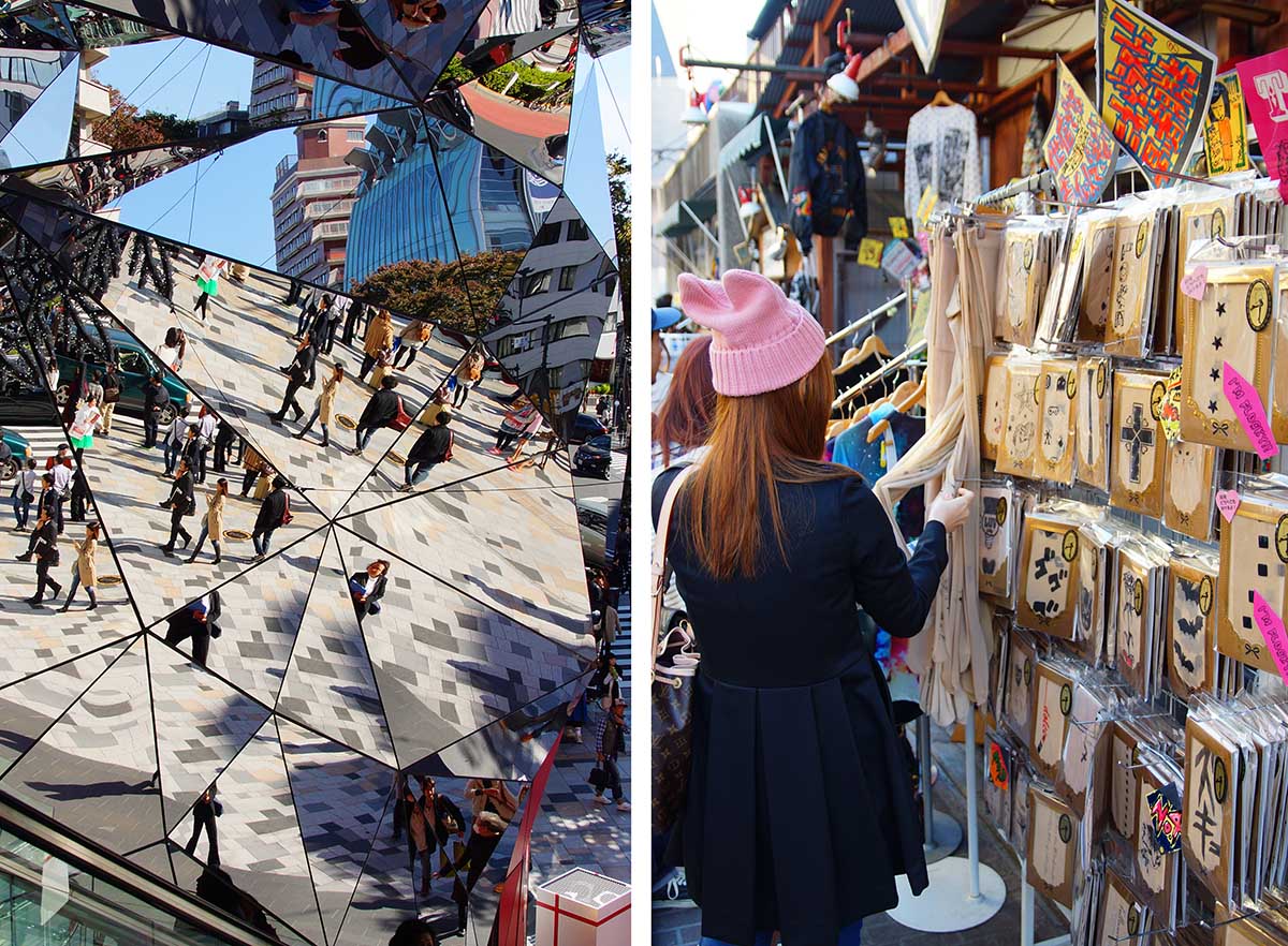 In Shibuya ligt de buurt Harajuku, beroemd om haar hippe winkels en jongerencultuur. De bekendste straat is Takashita-dori, het hart van de Japanse kawaii-cultuur. Kawaii betekent ‘schattig’ en de winkels hier zijn dan ook volgestouwd met alles wat onder die noemer valt. Naast boetieks vol extreme kleding en schattige knuffels staat de straat ook bol van cafés en restaurants. Hier eet je suikerspinnen die vijf keer zo groot zijn als je hoofd, pannenkoeken gevuld met alles wat je maar kunt bedenken en nog veel meer gekke etenswaren. Takashita-dori is in het weekend bizar druk, dus houd er rekening mee dat je schuifelend door de straat moet. Rond Takashita liggen grotere winkelstraten vol merkwinkels. Kijk even binnen bij Tokyu Plaza Omotesando, met de roltrap omringd door spiegels.