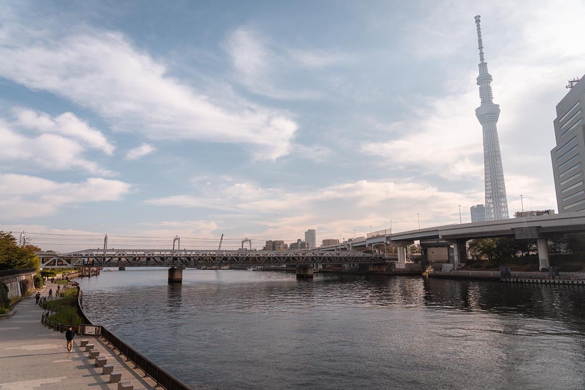 Langs de Sumida-rivier is een park aangelegd, waar je kunt wandelen en fietsen. Vanuit het park heb je een prachtig uitzicht op Tokyo Skytree.
