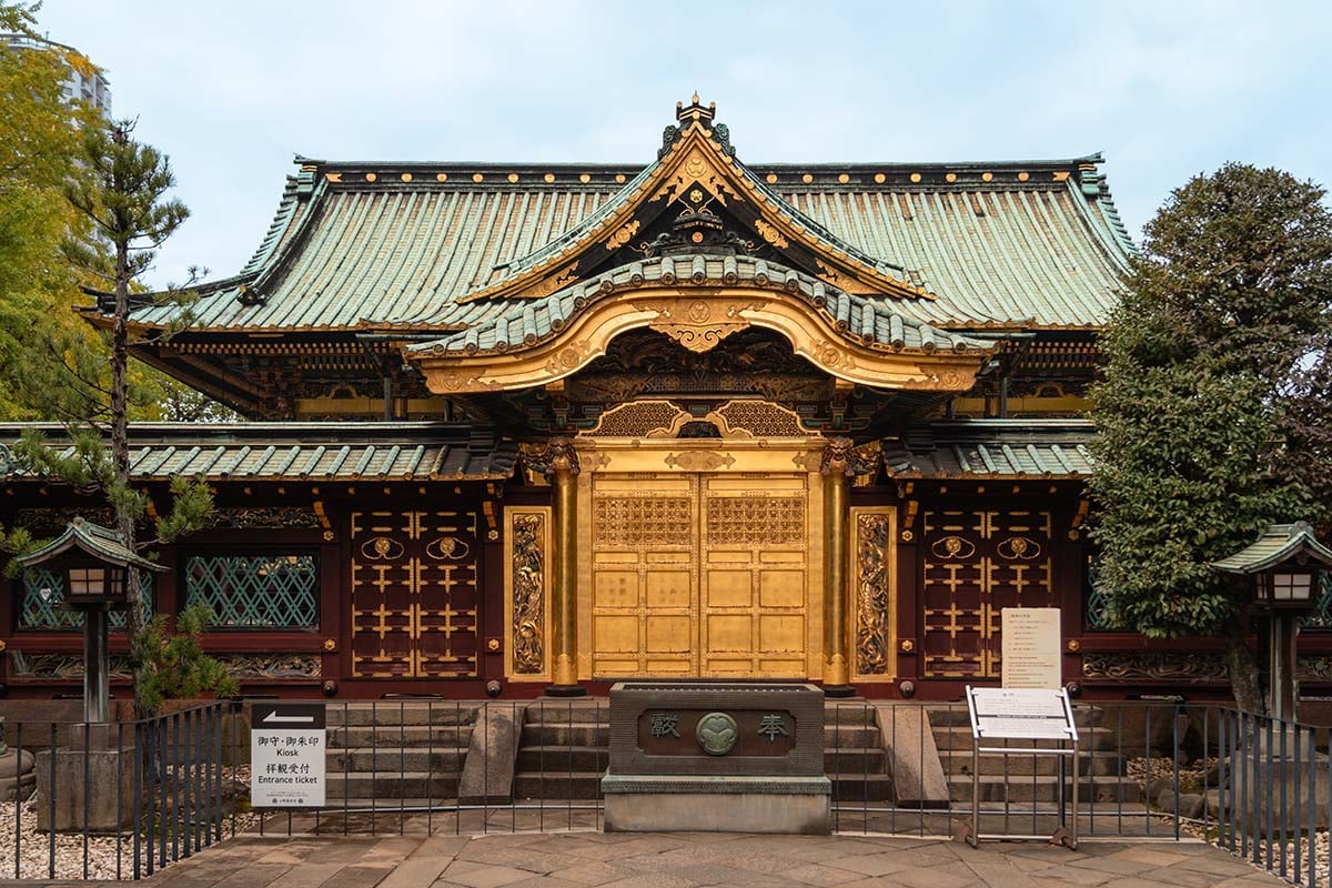 - Ueno Toshogu Shrine is een indrukwekkende gouden tempel, bereikbaar via een sfeervol wandelpad geflankeerd door stenen Japanse lantaarns. Op weg naar de tempel passeer je een hoge pagode en verschillende beelden. Je kunt de tempel deels van buiten bekijken, maar ik vond het ook mooi om de binnenkant en de omringende tuin te zien. Daar betaal je een kleine entreeprijs voor.