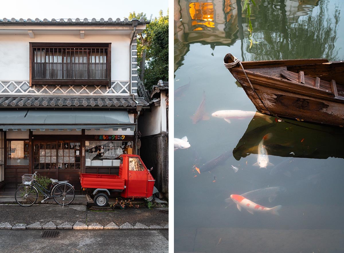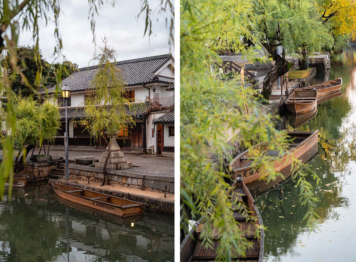De prachtige oude pakhuizen langs het kanaal van Kurashiki zijn omgebouwd tot musea, winkels, restaurants en cafรฉs. Dat is op zโn Japans gedaan, dus heel smaakvol en zonder schreeuwende borden en reclames. Daardoor is de wijk sfeervol gebleven en is het een feest om door de mooie straten te wandelen. Houd je van jeans, dan kun je hier je hart ophalen, want in Kurashiki verkopen verschillende Japanse designers hun denim kleren. Wil je niet alleen langs het kanaal wandelen, maar ook een boottochtje maken? Dat kan, want de roeibootjes varen bij mooi weer af en aan. Tijdens ons bezoek regende het en lagen de bootjes aan de kant. Voor de fotoโs misschien beter ๐