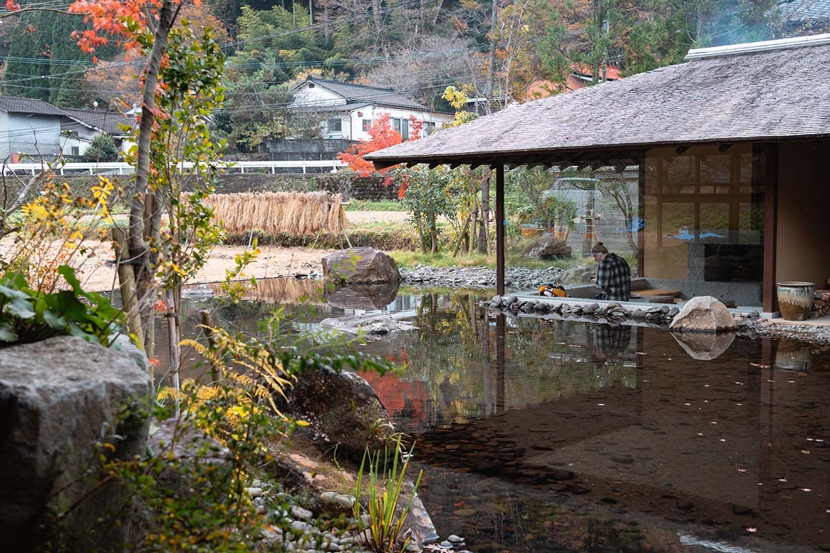 Na de hike reden we door naar onze overnachtingsplek bij Kurokawa Onsen, met onderweg nog een stop bij Takenokuma Cafรฉ. Dit sfeervolle koffiehuis ligt in een dorpje tussen de rijstvelden, aan een mooie vijver. Hier drink je heerlijke specialty coffee, eventueel met iets lekkers erbij.