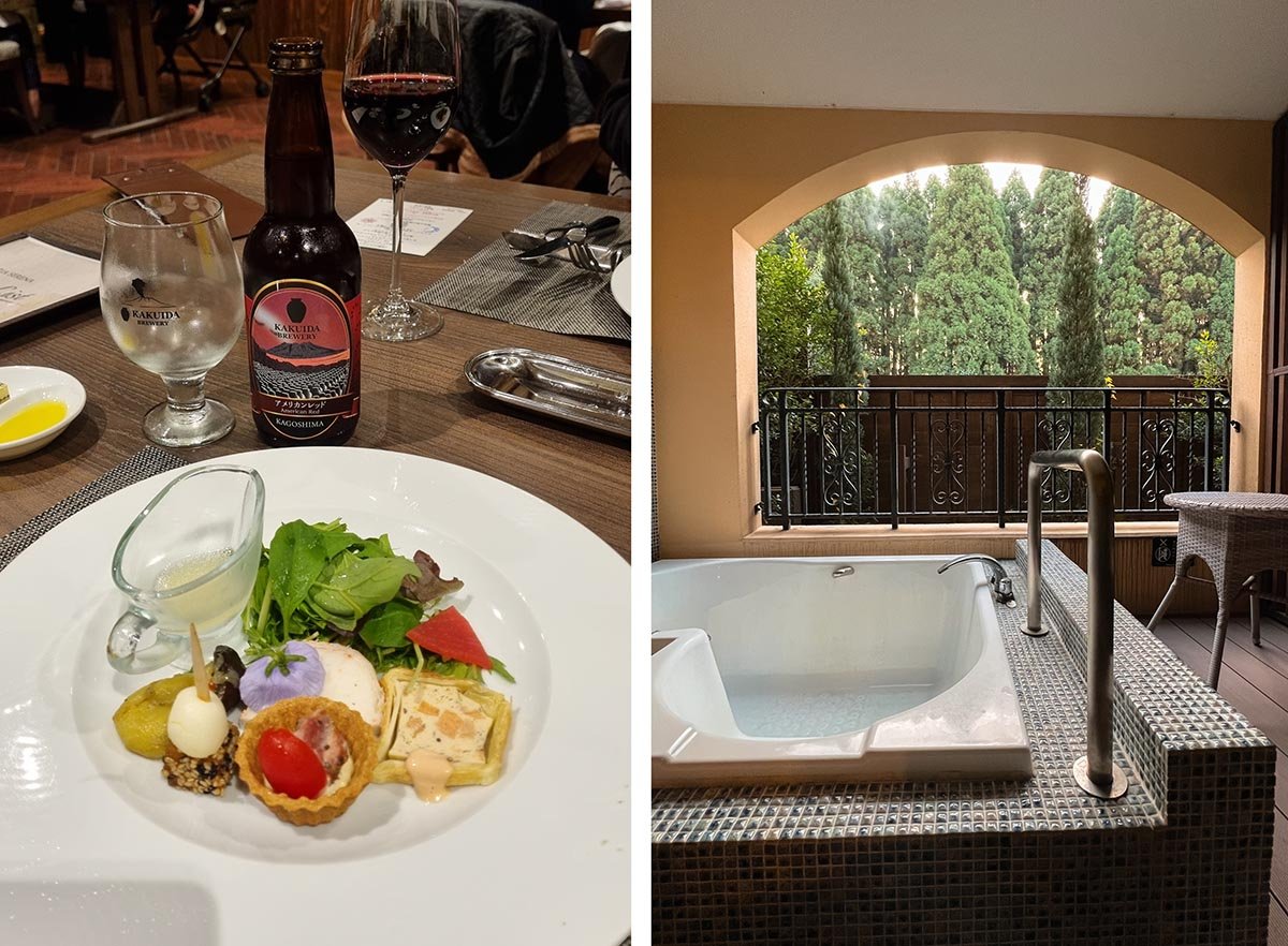 Wij verbleven bij La Vista Kirishima Hills, een onsenhotel in de heuvels. Het is een wat groter hotel met zwembad, eigen openbare onsen (thermisch bad) รฉn een onsen op het balkon van je kamer. Heerlijk om hier te badderen in het hete water als het buiten koud is. Je kunt in het hotel ook diner bijboeken en we kregen een heerlijk zevengangenmenu voorgeschoteld. Echt een heel fijne plek om een nachtje door te brengen.