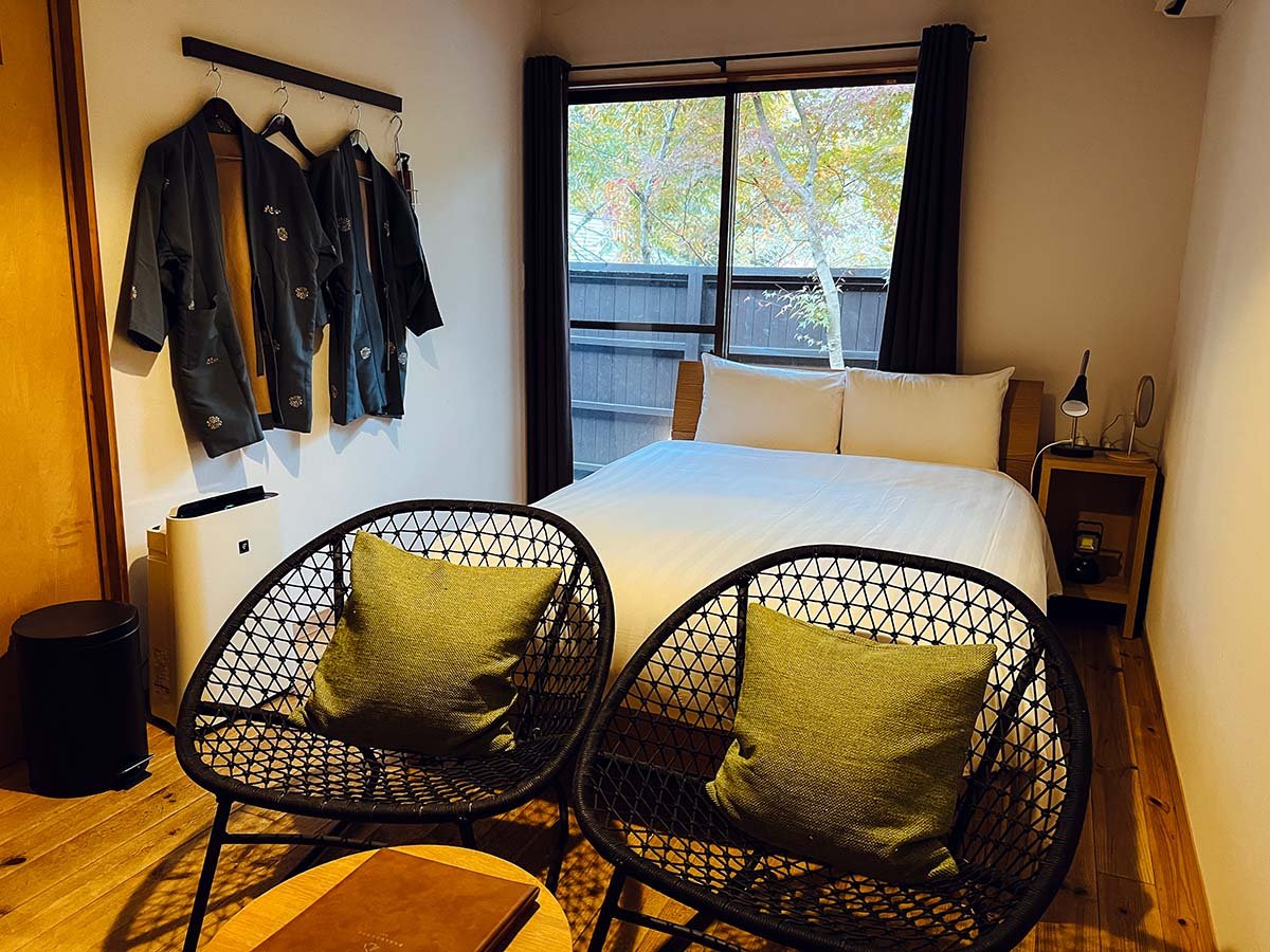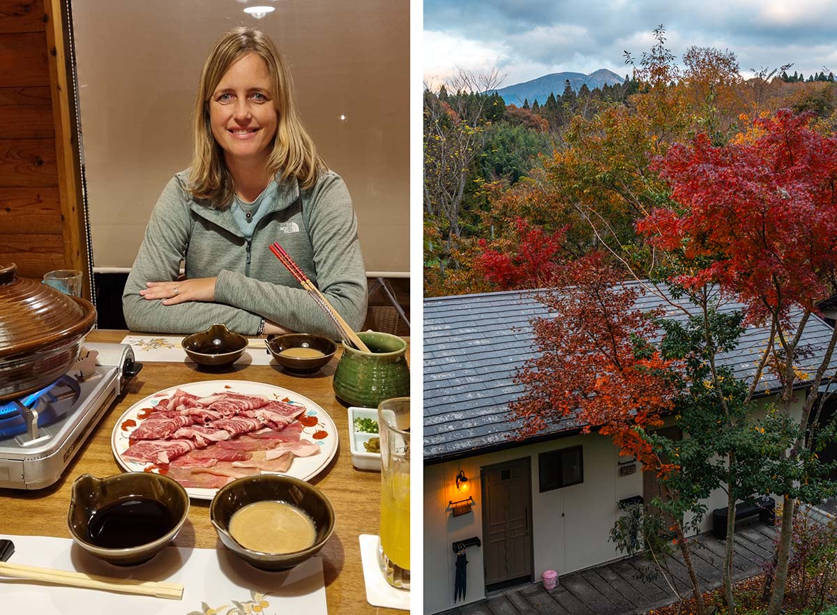 Japan heeft verschillende onsen-stadjes, waar je heerlijk kunt relaxen in thermische onsen. Kurokawa Onsen is รฉรฉn van de mooiste, meest sfeervolle onsen-dorpen, zeker in de herfst. Wij sliepen vlakbij dit dorp, in het mooie onsenhotel Hanare no Yado Hanagokoro. Onze kamer was voorzien van eigen heetwaterbad en we hadden zowel diner als ontbijt bijgeboekt. Het eten is meer dan fantastisch en bestaat uit meerdere gangen, waaronder shabu-shabu (hotpot) met wagyubeef. Heerlijk!
