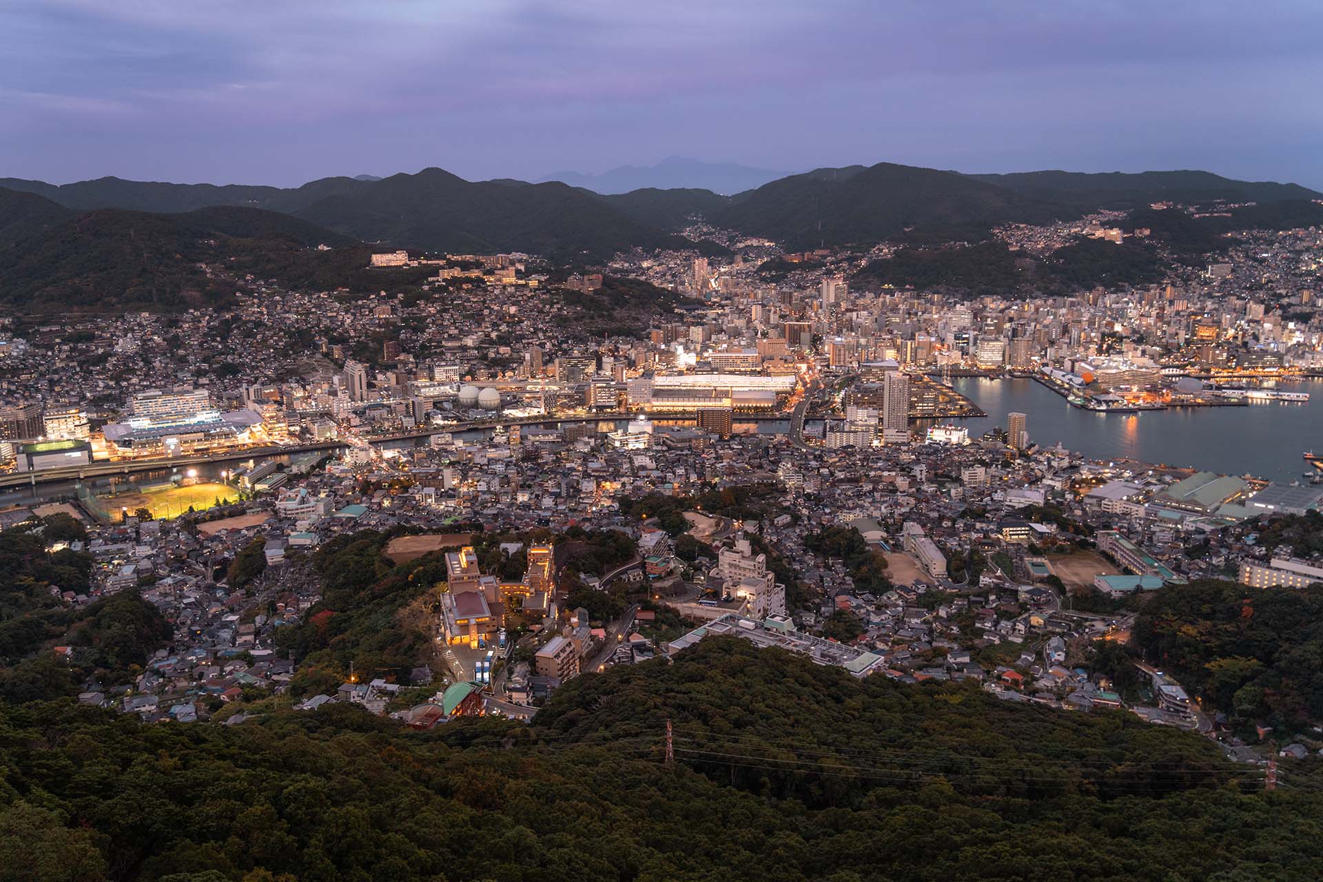 Het uitzicht vanaf Mount Inasa is gekozen tot รฉรฉn van de drie beste โnight viewsโ van Japan. Neem een half uur voor zonsondergang de kabelbaan (de Nagasaki Ropeway) naar boven, zodat je langzaam de lichtjes van Nagasaki aan ziet gaan. De stad ligt prachtig in een heuvelachtige baai en het uitzicht vanaf Mount Inasa is schitterend. Vergeet ook niet om naar de zonsondergang te kijken (aan de andere kant van de stad), want die kan hier spectaculair zijn. Wij hadden er in elk geval veel geluk mee. De rit met de Ropeway duurt ongeveer vijf minuten en de kabelbaan gaat elke twintig minuten. Je hoeft dus nooit lang te wachten en het ritje is zeker รฉรฉn van de leukste dingen om te doen in Nagasaki.
