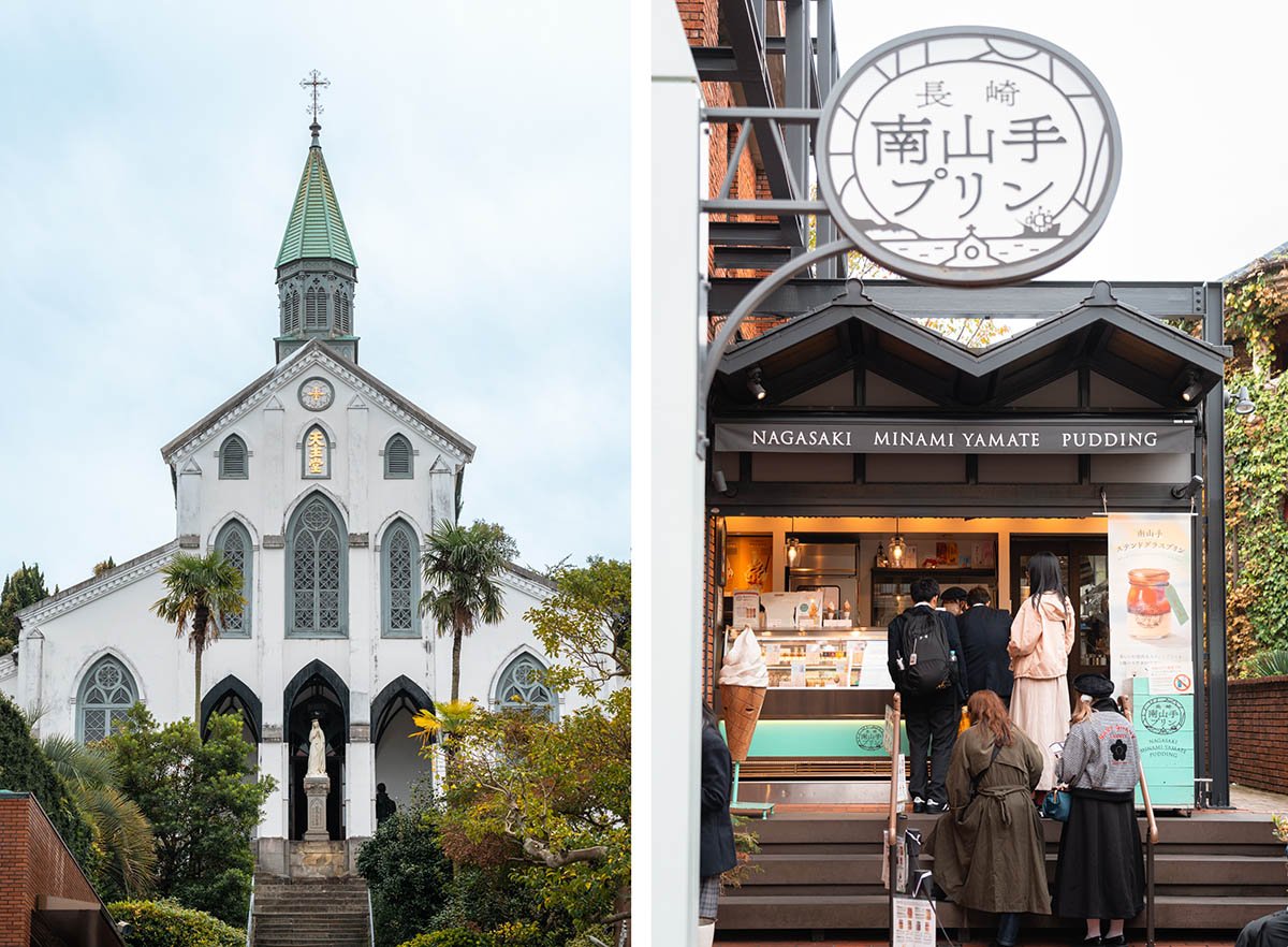Vrijwel naast de ingang naar Glover Garden staat de Oura Cathedral, een katholieke kerk die gebouwd werd in 1865. De kathedraal zelf vond ik niet zo bijzonder, maar de straat die hier naartoe leidt is wel erg leuk om te bezoeken. Dit is het toeristische hart van Nagasaki (inclusief gebouwen in Nederlandse stijl) en wordt overspoeld door kinderen op schoolreisjes. In de straat zitten talloze winkels, bakkerijen en winkels waar je lekkere snacks kunt kopen en het is leuk om te zien hoe de schoolkinderen enthousiast hun zakgeld uitgeven. Heel populair zijn de winkels met Nagasaki Pound Cake, dรฉ zoete delicatesse van Nagasaki. Ook geliefd: de puddinkjes en het softijs van Nagasaki Miname Yamate Pudding.