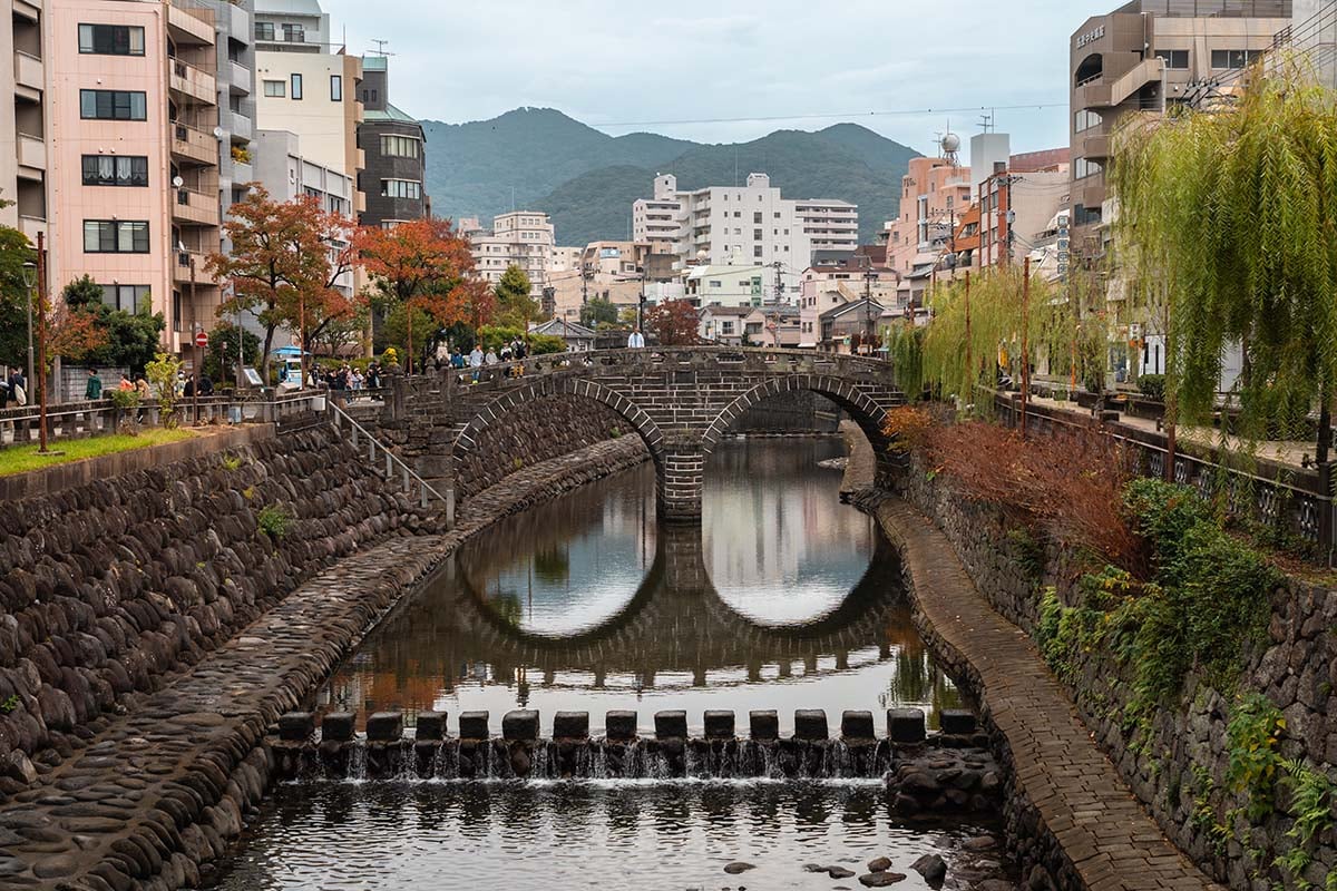 Door Nagasaki stroomt de Nakashima-rivier en ik vond dit een leuke plek om rond te wandelen. De rivier wordt overspannen door verschillende stenen bruggen, gebouwd in de 17e eeuw. Elke brug is anders en vooral de Meganebashi Bridge is een populaire fotospot. Zeker bij schoolkinderen op schoolreisje! Langs het water vind je oude koopmanshuizen en winkels.