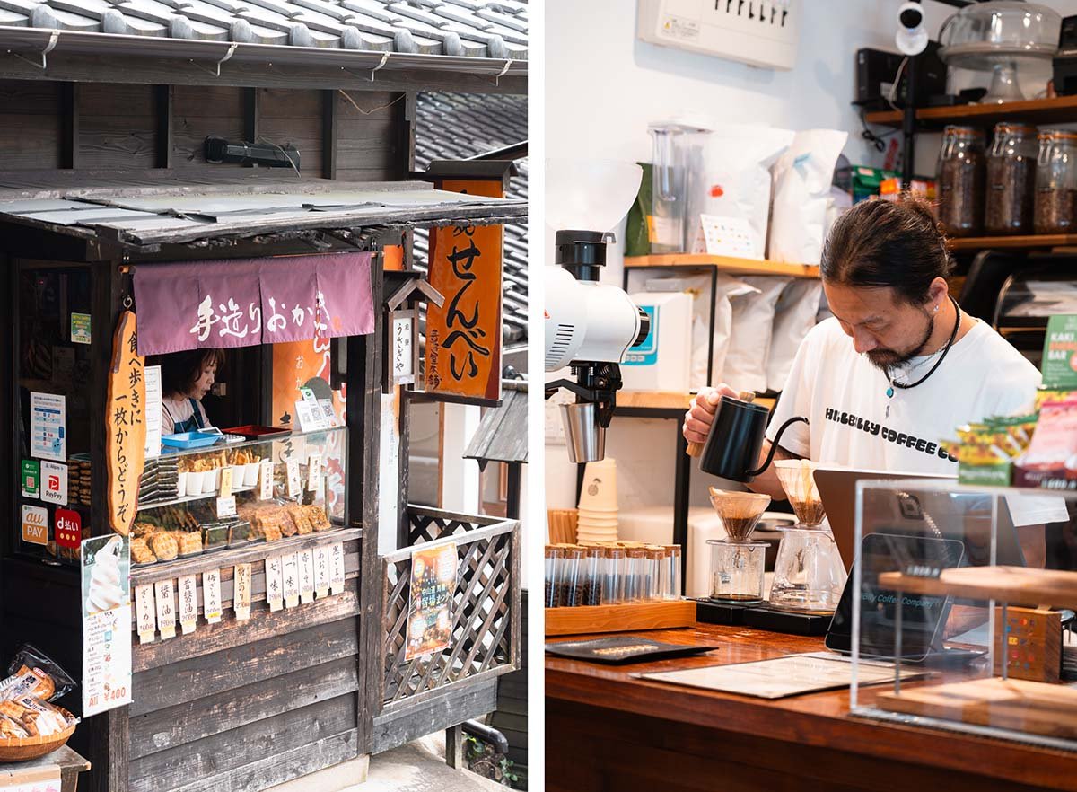 Het maakt niet veel uit of je in Magome of Tsumago met de wandeling begint, maar bij een start in Magome hoef je net wat minder te klimmen. Wij reisden vanuit Fuji Five Lakes naar Magome. In de middag bekeken we dit schattige, sfeervolle dorp vol leuke winkeltjes, restaurantjes en kraampjes met unieke Japanse snacks. En niet te vergeten: de geweldige HillBilly Coffee Company, die heerlijke specialty koffie serveert.