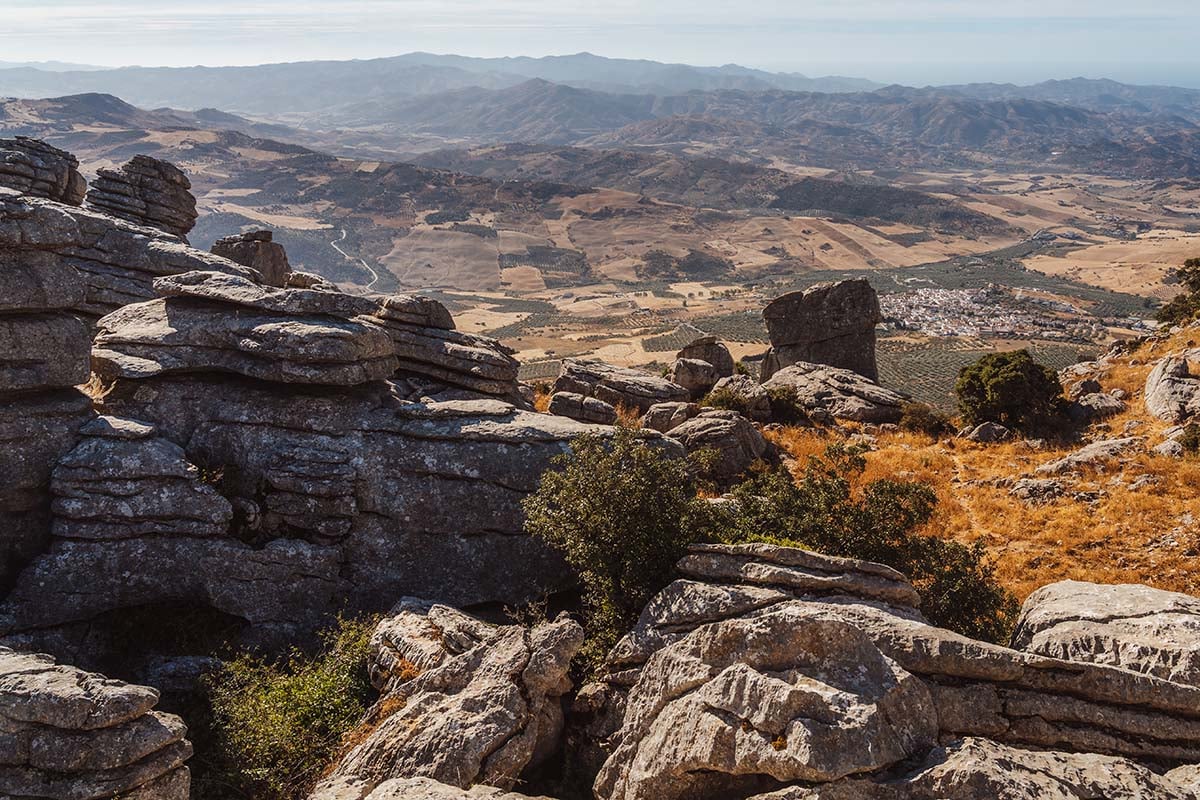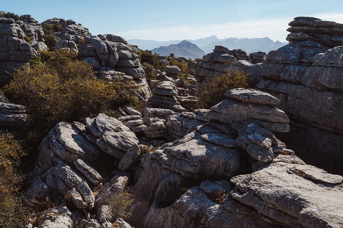 Natuurpark El Torcal de Antequera ligt een uurtje rijden ten noorden van Málaga en is dan ook prima geschikt voor een dagtrip vanuit de stad. Ik bezocht het natuurgebied onderweg van Málaga naar Nerja, een omweg die ik erg de moeite waard vond. Vanuit de stad rijd je al snel de bergen in en zodra je Torcal nadert kom je in een compleet ander landschap terecht. De weg slingert omhoog, de uitzichten worden steeds weidser en langs de weg zie je grote kalkstenen rotsformaties opdoemen.