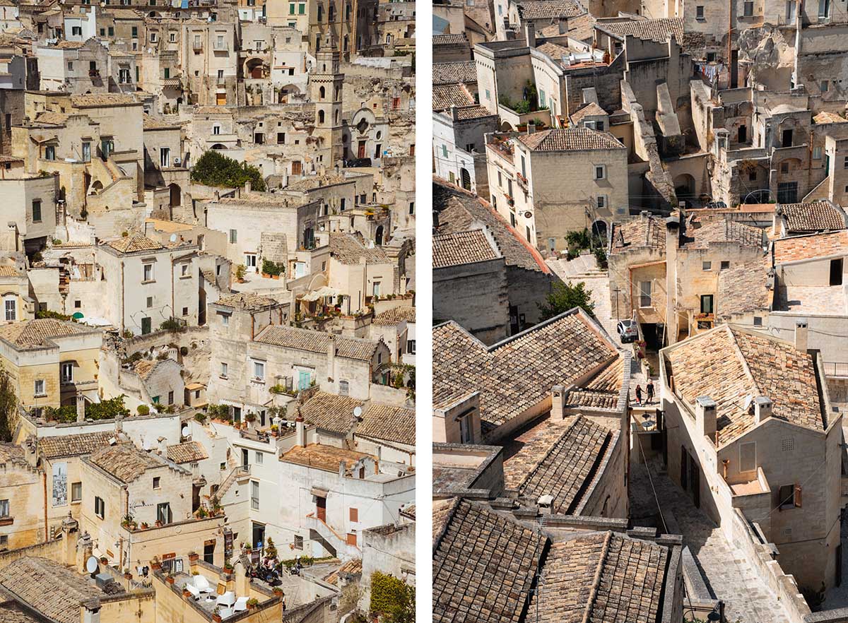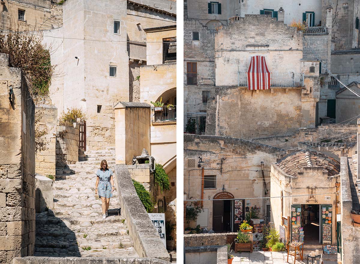 Het oudste gedeelte van Matera bestaat uit twee sassi, wijken met oude grotwoningen: Sasso Barisano en Sasso Caveoso. Sasso Barisono is het meest ontwikkelde deel van het oude Matera. Aan de randen van Sasso Caveoso kun je nog zien hoe de oorspronkelijke, niet- opgeknapte grotwoningen erbij lagen. De sassi vormen een labyrint van oude woningen, pleinen en kerken, die deels zijn uitgehouwen in de rotsen en deels bovenop de rotsen zijn gebouwd. De bijzonder fotogenieke wijken worden gesplitst door een heuvelrug waarop de Duomo van Matera is gebouwd. Ze vormen een fantastische wirwar van straatjes, met elkaar verbonden door trappen en steile steegjes. Eindeloos dwalen en steeds weer een mooi nieuw hoekje ontdekken is dan ook het leukste om te doen in Matera. Door de terrasvormige opzet van de stad, kom je bovendien steeds nieuwe uitzichtpunten tegen, waar de zee van huizen zich fotogeniek voor je uitstrekt.